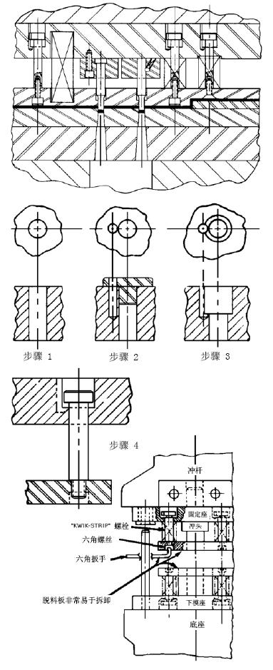 如需將現有模具改裝為使用杰根斯Kwik-Strip快卸螺栓,只需在原有的脫卸孔邊上銑一個1/4"寬的槽,然后再在脫料板上加工出配六角螺絲的沉孔即可.