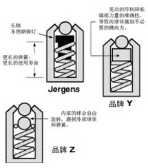 準確的彈簧位置是由一個不銹鋼鉚釘保證的。該鉚釘鉚接在一個大尺寸的杰根斯球頭柱塞軸上。這樣就能更精確地定位彈簧, 從而保證更準確的柱塞球行程, 并能使彈簧彈力得到正向控制。通常的浮盤或雙球結構柱塞中 (見上圖, Brand Y & Z),浮盤容易錯位,內球也會轉動, 從而導致柱塞彈簧和球頭容易磨損。