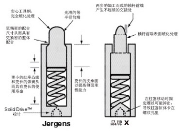 大部分工廠制造的彈簧柱塞頭都是表面硬化處理。這就意味著它們有2.5mm厚的保護殼。在這層薄壁下面的是未經處理的軟質鋼材。而杰根斯的彈簧柱塞則是用工具鋼整體淬火硬化處理制成。