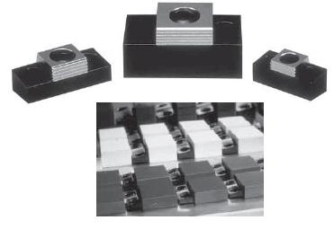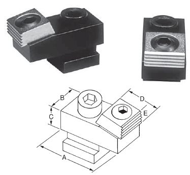 該產品同上面的側向壓緊塊相似, 區別是該產品用在機臺的T形工槽上, 向工件提供正向下壓力. 淬火鋼材料的壓緊塊既有一個光滑面用于夾持已加工工件, 又有一個齒紋粗面用于夾持更粗的工件.