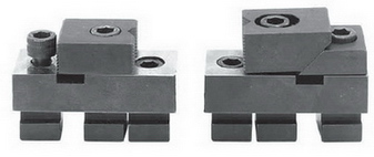 定位固定爪夾, 上緊所有三個帽螺絲以穩定壓塊. 定位其中可調壓塊, 并上緊外面的帽螺絲. 置入工件并上緊中央帽螺絲. 可調爪夾就會將工件壓向基板, 并反向壓緊固定爪夾.