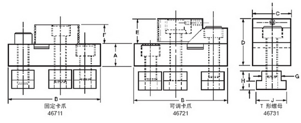 該產品提供準確的定位和正向夾持力. 為了準確定位, 其基板硬化處理, 并且磨到與杰根斯支承墊高度一致. 卡爪為齒紋, 并且硬化處理, 以提供正向壓緊力. 這些萬能壓緊器可如示意圖應用, 也可把卡爪倒轉, 使工件可固定在機器工作臺或夾具板上. 拿掉T槽螺母, 將3/8-16英寸的帽螺絲直接鎖緊在夾具上, 該產品就可制成為一套專用夾具的一個組成部分.