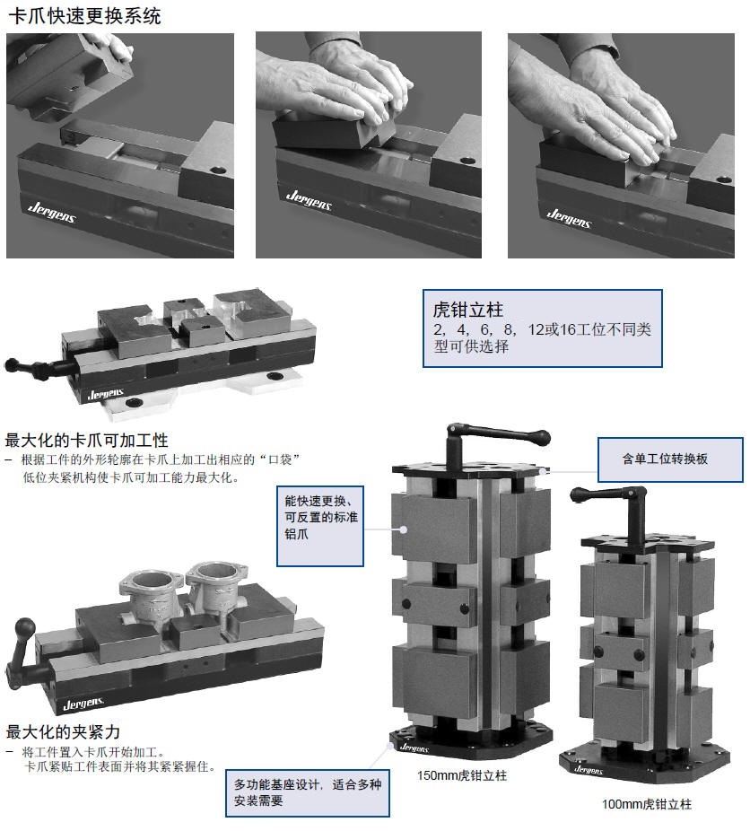 卡爪快速更換系統 虎鉗立柱 2, 4, 6, 8, 12或16工位不同類 型可供選擇 最大化的卡爪可加工性 - 根據工件的外形輪廓在卡爪上加工出相應的“口袋” 低位夾緊機構使卡爪可加工能力最大化。 能快速更換、可反置的標準鋁爪 含單工位轉換板 最大化的夾緊力 - 將工件置入卡爪開始加工。 卡爪緊貼工件表面并將其緊緊握住。 多功能基座設計, 適合多種安裝需要 150mm虎鉗立柱 100mm虎鉗立柱