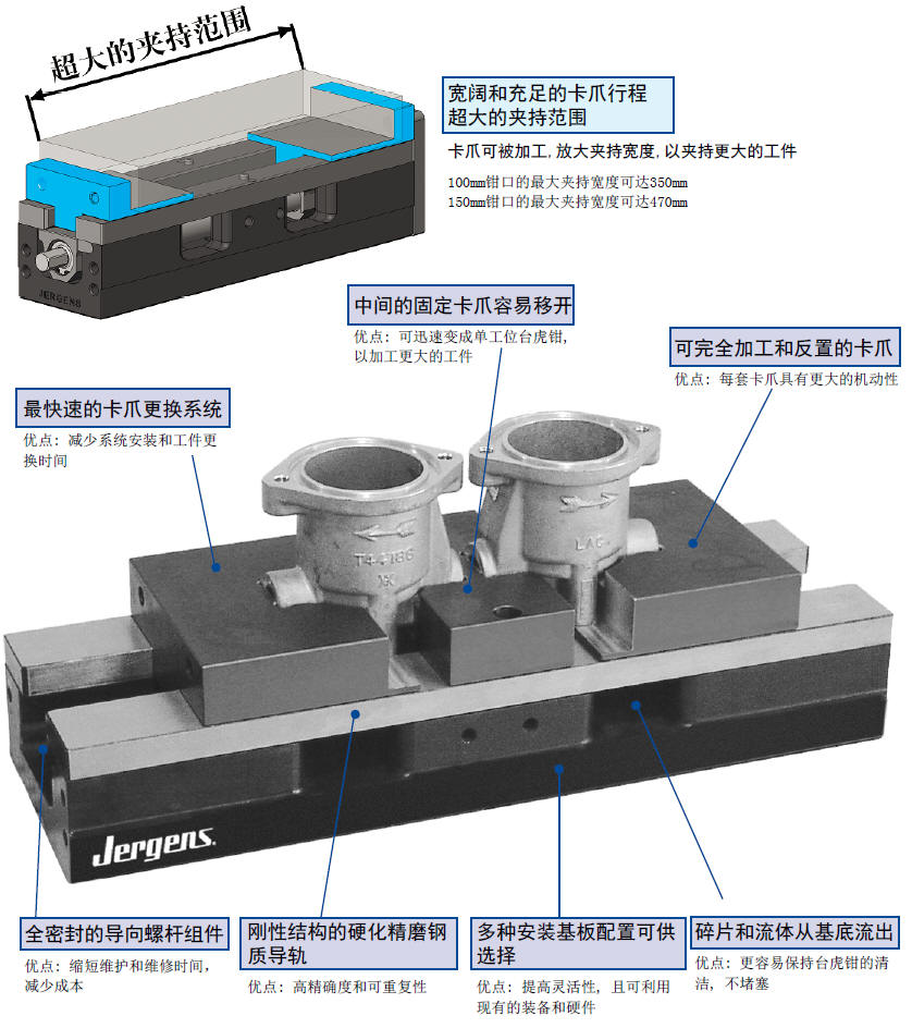優點: 可迅速變成單工位臺虎鉗,以加工更大的工件