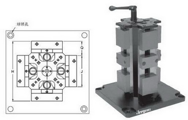 4面立柱是杰根斯的一種可靠耐用虎鉗立柱, 其上有8個工位夾持工件. 有兩個標準的基座可供選擇, 其中, 通用型基座利用相距80mm或100mm的加工中心上的安裝孔, 可直接安裝到臥式(HMC)中心工作臺上. 如果將杰根斯的球鎖系統安裝在臥式(HMC)中心上, 將更大地提高加工生產效率, 虎鉗立柱和任何其他夾具的更換將少于一分鐘, 夾具每次的重復定位精度將在0.013mm之內.