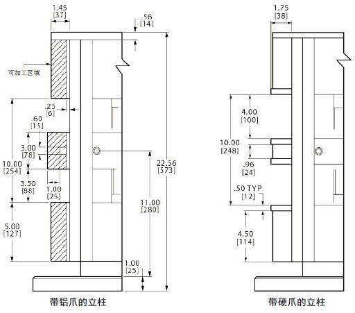 * 通用型立柱上的基座有兩套安裝孔, 匹配80mm或100mm加工中心上的夾持裝置或T槽。