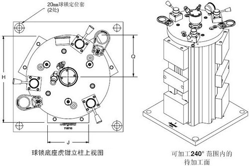 如果將杰根斯的球鎖系統應用在臥式加工中心(HMC)工作臺上,將進一步提高加工生產效率。更換虎鉗立柱或其他夾具只需不到一分鐘的時間,夾具的重復定位精度將在±0.013mm以內。 |